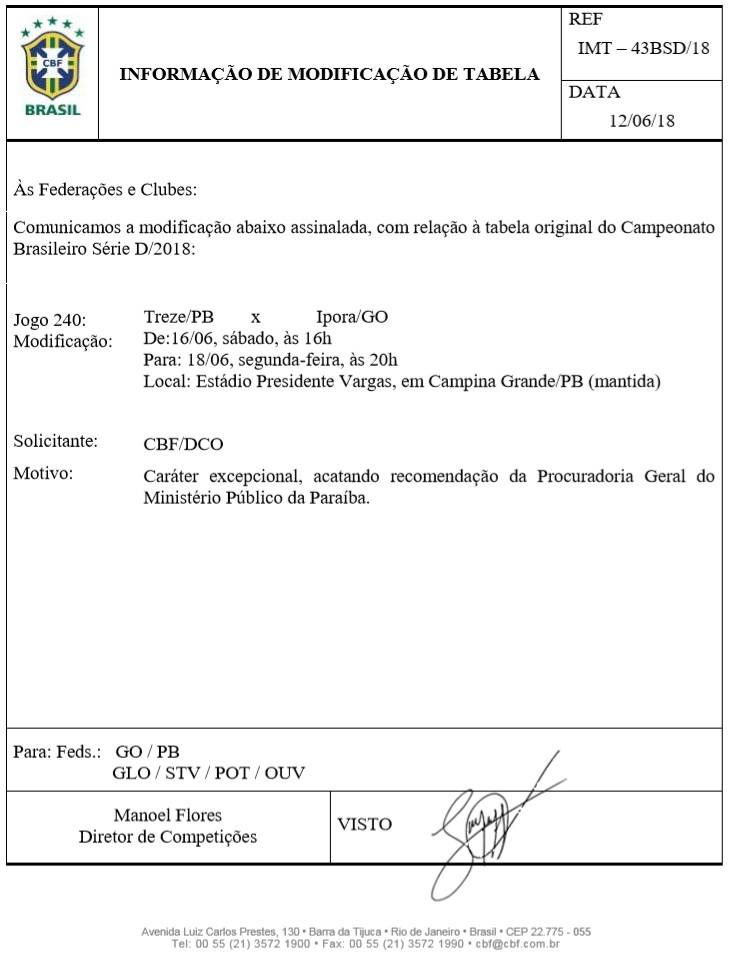 No caso de Treze x Iporá-GO, originalmente marcado para as 16h de sábado (16), passou para a segunda-feira, dia 18, com o horário alterado para 20h. O local permanece sendo o estádio Presidente Vargas.