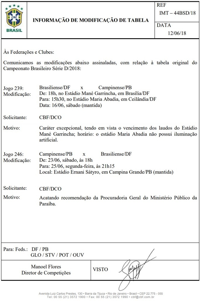 O detalhe é que a CBF alterou também o local do jogo da ida entre candangos e paraibanos. Antes marcada para o Mané Garrincha, a peleja passou para o Estádio Maria Abadia, em Ceilândia, e o horário foi antecipado das 18h para as 15h30.