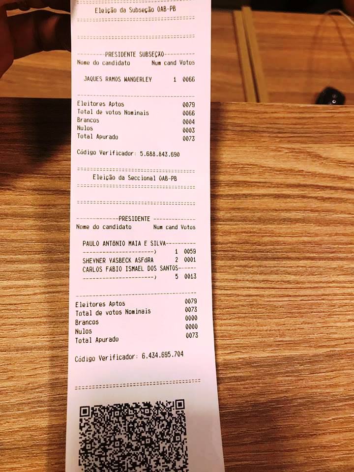 Já a votação em nível local para presidente da Seccional da OAB definiu a vitória de Paulo Antônio Maia e Silva com 59 votos, em segundo lugar ficou Carlos Fábio Ismael dos Santos (13) e na sequência Sheyner Yasbeck Asfora (01). Não foram contabilizados votos nulos nem brancos.