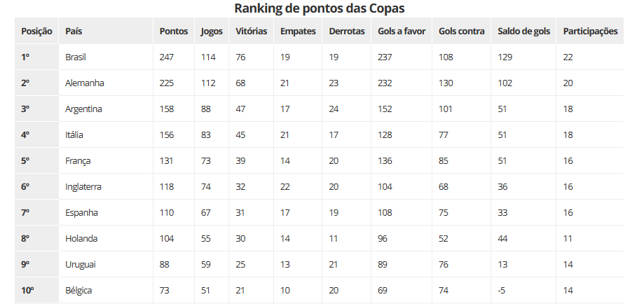 Já o Brasil, mesmo chegando a um jejum de 24 anos sem conquistas na Copa de 2026, a ser disputada nos Estados Unidos, México e Canadá, permanece como a seleção que mais somou pontos na história da competição, com 22 a mais que a Alemanha.
