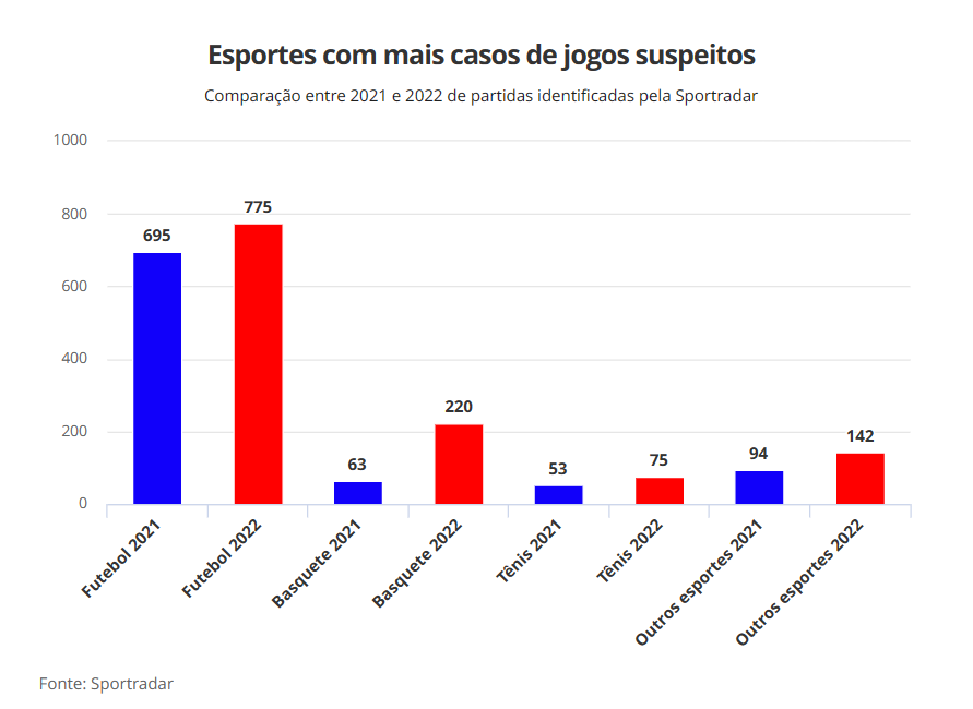 A média de partidas duvidosas em todos os esportes subiu. No ano passado era de uma a cada 475, contra uma a cada 545 em 2021.