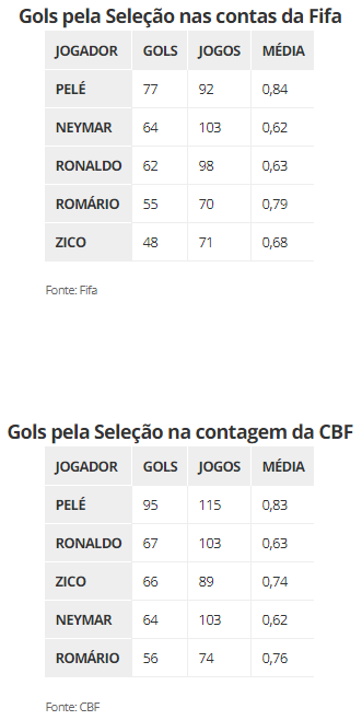 Neymar chegou aos 64 gols em 103 partidas pela Seleção. Ronaldo balançou as redes 62 vezes em 98 duelos. Pelé precisou de menos jogos para marcar mais gols. Foram 77 gols em 92 compromissos com a amarelinha.