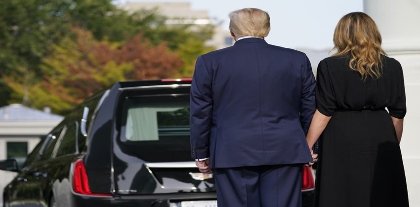 Donald Trump e Melania Trump acompanham cortejo de caixão com o corpo de Robert Trump na Casa Branca nesta sexta-feira (21) — Foto: Evan Vucci/AP Photo