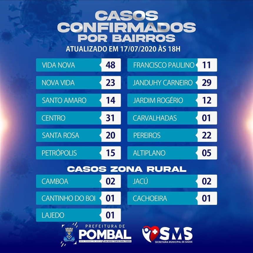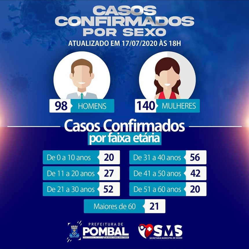 Boletim oficial da secretaria de saúde da prefeitura de Pombal publicado na tarde desta sexta-feira (17), mostra que mais sete (7) casos foram registrados e o município tem agora, 238 casos confirmados de COVID-19, através de exames realizados, aumentando os casos nas últimas 24 horas.