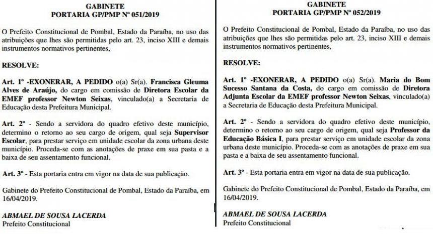 O prefeito do município de Pombal, Abimael de Sousa Lacerda, exonerou as professoras Francisca Gleuma Alves de Araújo, que respondia pela direção da EMEF “Newton Seixas” e Maria do Bom Sucesso Santana da Costa (Adjunta).