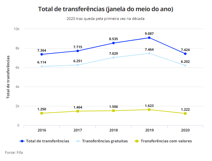 Houve um total de 7.424 transferências na janela do meio do ano, uma queda significativa, de quase 18%, com relação a 2019, quando 9.087 atletas mudaram de clubes. O número de 2020 é o menor desde 2017, ficando bem próximo do patamar de 2016, quando 7.364 transferências foram realizadas no mesmo período.