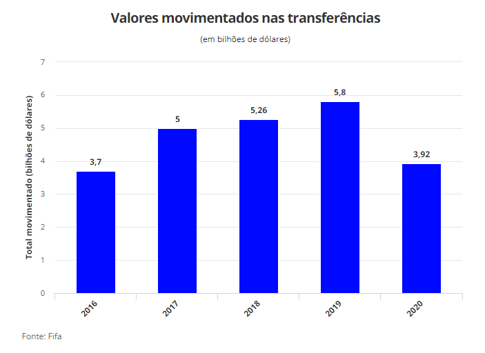 Entre as 7.424 negociações concretizadas entre junho e outubro, 1.222 envolveram valores e taxas, com outras 6.202 ocorrendo de forma livre. Um total de 3,92 bilhões de dólares (R$ 21,7 bilhões) foi movimentado com as transferências – uma queda de mais de 30% com relação a 2019, quando 5,8 bilhões (R$ 32,1 milhões) foram envolvidos em 1.623 negócios. O valor não era tão baixo desde 2016.