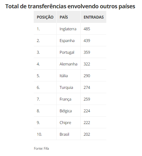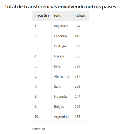 Em uma análise separada por país, o Brasil é o único não-europeu que aparece entre os 10 que mais receberam atletas de fora – e também entre os que mais enviaram. A Inglaterra foi o país que mais contratou reforços de fora, em um total de 485 jogadores, e o Brasil foi o 10º, com 202. No ranking dos que mais enviaram atletas para outras nações, a Inglaterra também é líder, com 524 – o Brasil é o quinto, com 329.