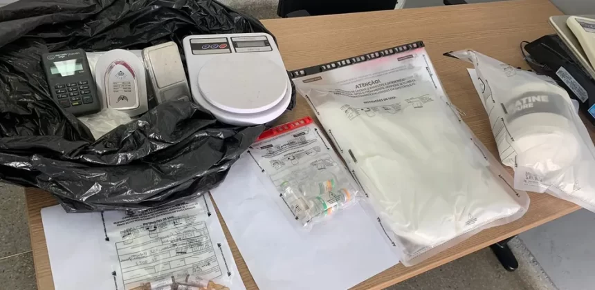 O suspeito entrou em uma casa e conseguiu fugir por um terreno que fica por trás da residência. No local, os agentes encontraram substância semelhante a cocaína, frascos para uso hospitalar, embalagens e equipamentos como balança de precisão.