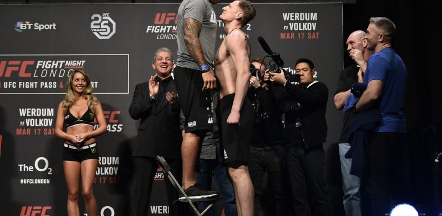 Do outro lado, Volkov vem de cinco triunfos consecutivos, sendo três pelo Ultimate e dois pelo M-1, antes de ser contratado pelo UFC. Especialista em caratê, o russo vem de nocaute sobre Stefan Struve e é ex-campeão do Bellator e do próprio M-1.