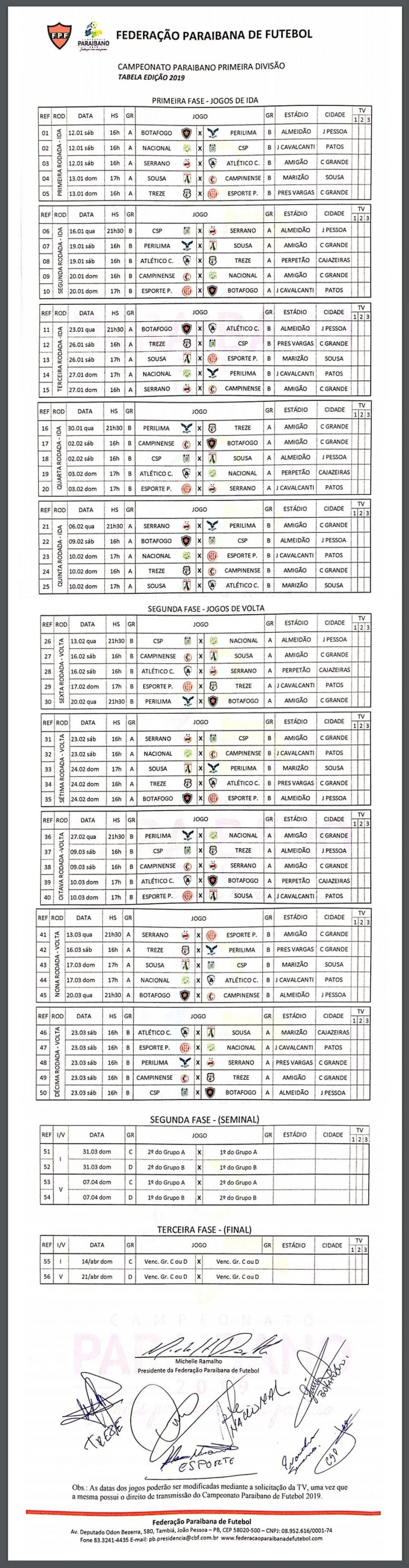 A Federação Paraibana de Futebol (FPF), enfim, divulgou a tabela completa do Campeonato Paraibano de 2019. Faltando exatos 23 dias para o início da competição, o documento detalhado – com datas, horários e locais das partidas – tornou-se público na noite desta sexta-feira. A competição começa no dia 12 de janeiro e termina em 21 de abril.