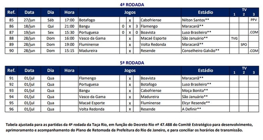 A Federação Carioca de Futebol divulgou na tarde desta terça a tabela detalhada do complemento da 4ª rodada da Taça Rio, com jogos de Botafogo (sábado) e Fluminense (domingo) no próximo fim de semana. Os dois clubes são contra e só querem jogar a partir de julho.