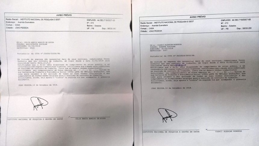 O fato resultou na rescisão de seus contratos de trabalho pela empresa Instituto Nacional de Pesquisa e Gestão, contratos esses que teriam sido efetivados na data 01/02/18, embora há mais de trinta anos atuavam na prestação de serviços em unidades de ensino da cidade de Pombal.
