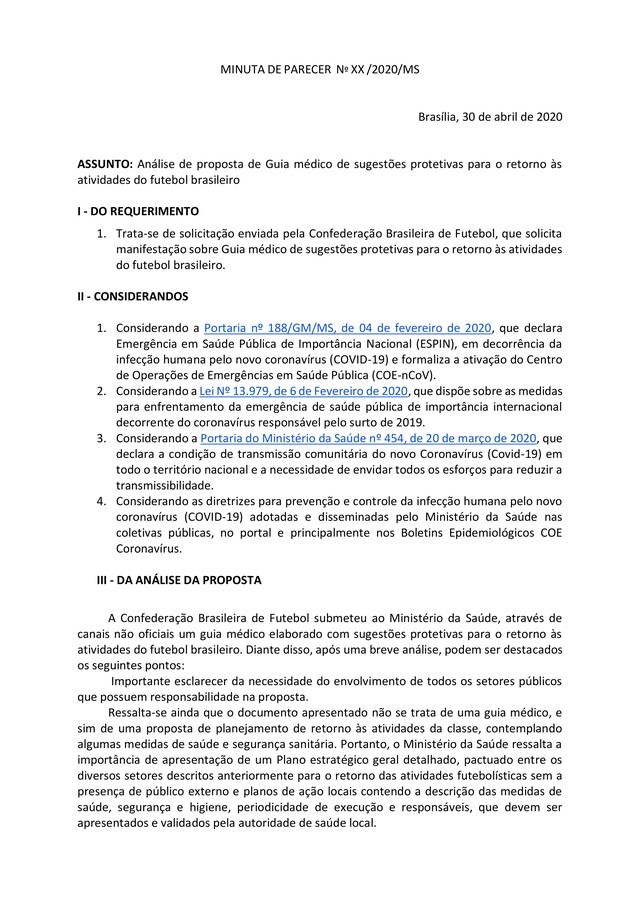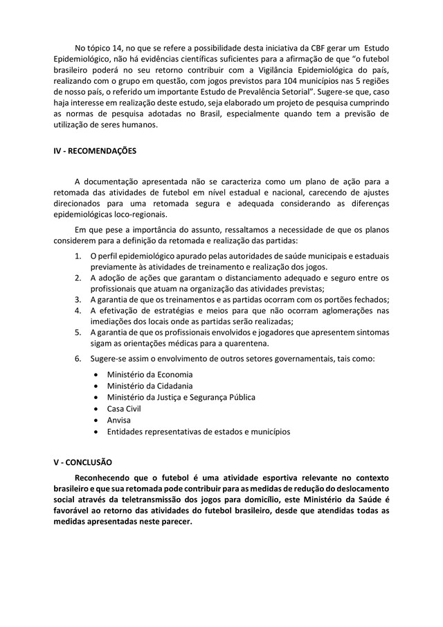 Em resposta ao protocolo médico nacional da CBF, o Ministério da Saúde se disse favorável à retomada do futebol. No documento, uma minuta de parecer, que já chegou à CBF e a diversos clubes, o órgão do Governo Federal faz diversas ressalvas sobre o “Guia para Retomada Progressiva” do futebol, elaborado por médicos de clubes e da entidade nacional do futebol, mas conclui que “o futebol é uma atividade esportiva relevante no contexto brasileiro e que sua retomada pode contribuir para as medidas de redução do deslocamento social através da teletransmissão dos jogos para domicílio”.