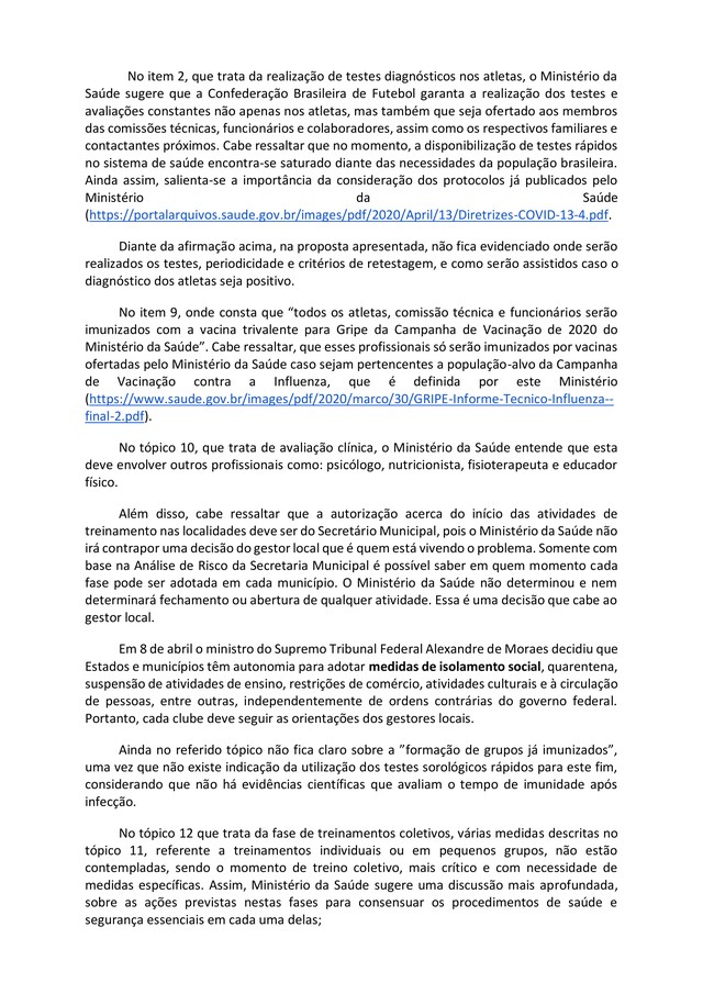Em outro trecho, o Ministério da Saúde ressalta “a importância de apresentação de um Plano estratégico detalhado, pactuado entre os diversos setores… para o retorno das atividades futebolísticas sem a presença de público externo e planos de ação locais contendo a descrição das medidas de saúde, segurança e higiene, periodicidade de execução e responsáveis, que devem ser apresentados e validades pela autoridade de saúde local”.
