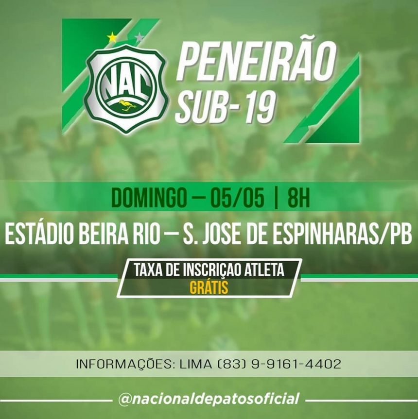 Sem competições profissionais para disputar após o fim do Campeonato Paraibano, o Nacional de Patos já vem trabalhando em outras frentes visando a sequência da temporada 2019. O Naça está montando sua equipe sub-19 para a disputa do estadual da categoria, que vai se iniciar no dia 6 de julho. A fim de ampliar o leque e descobrir novos talentos, o clube está realizando seletivas em várias cidades paraibanas e também de fora do estado. O Canário do Sertão vai realizar sua segunda seletiva neste domingo, em São José de Espinharas, cidade circunvizinha de Patos. O evento está marcado para as 8h, no Estádio Beira Rio.
