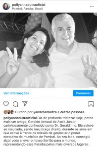 A deputada Pollyanna Dutra emitiu nota de pesar, por meio das suas redes sociais, na tarde desta quinta-feira (6), pelo falecimento do médico Dr. Geraldo Arnaud de Assis Júnior, conhecido como Dr. Geraldinho. Ele, que foi vice-prefeito do Município de Pombal no período em que Pollyanna Dutra estava à frente da prefeitura municipal, faleceu vítima da Covid-19. No último dia 27 de julho o médico tinha sido transferido do Hospital Regional de Pombal para o Hospital Universitário Lauro Wanderley, onde ficou internado na Unidade de Terapia Intensiva (UTI) até esta quinta-feira, quando veio a óbito.