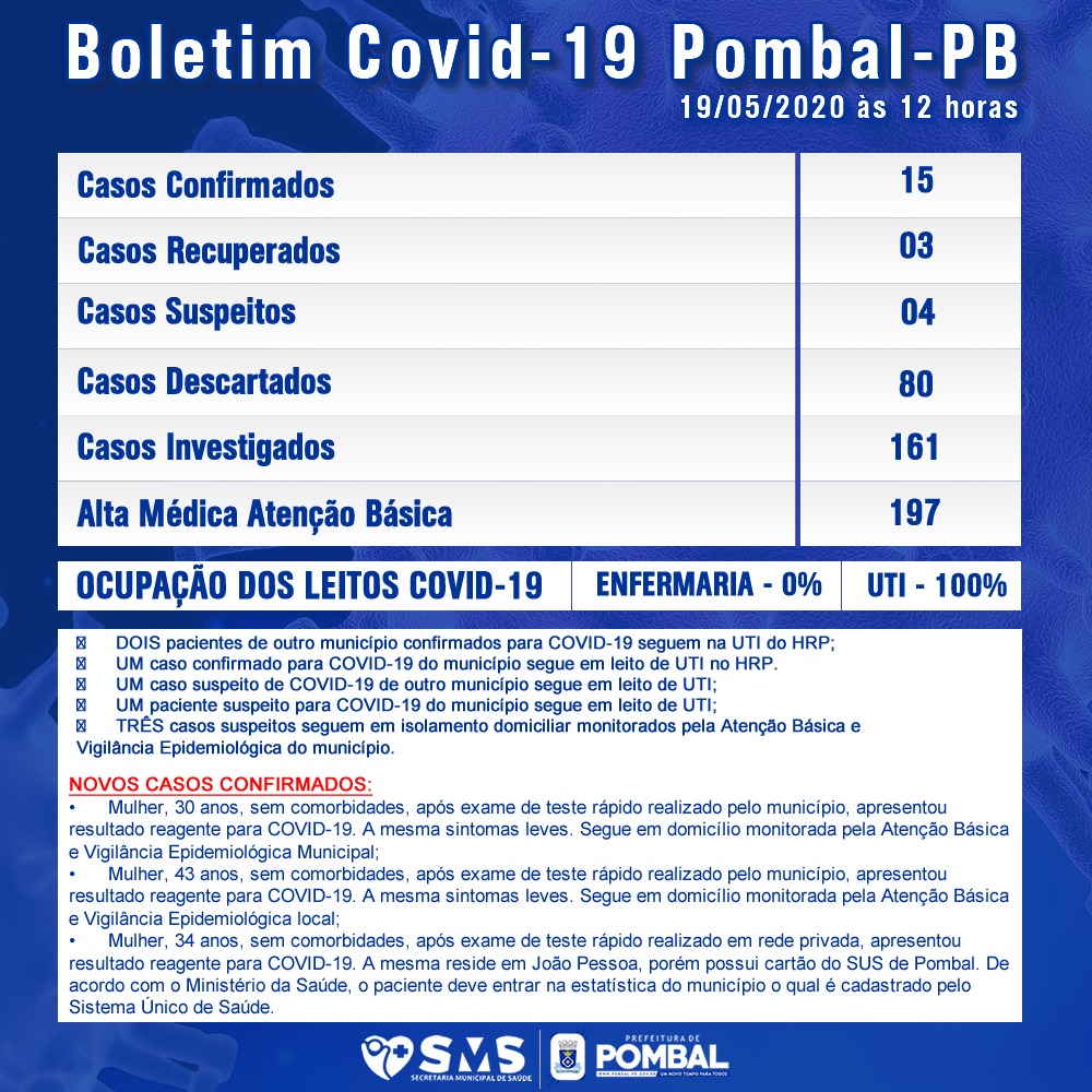 A cidade de Pombal tem confirmações de novos casos do COVID-19. Em um boletim emitido nesta terça-feira (19), pela secretaria municipal de saúde, o município atingiu 15 casos confirmados.