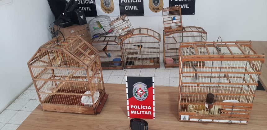 Durante a conversa com a autoridade policial foi confirmado o rompimento da tornozeleira e em ato continuo foram encontradas na residência do mesmo, várias gaiolas com aves silvestres, caracterizando-se crime ambiental.