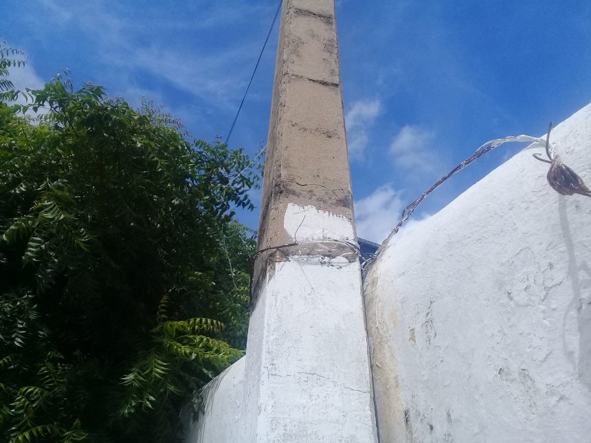 De acordo com ele, o mesmo se encontra inclinado e como medida de segurança apenas um arrame amarado a sua estrutura encostada à parede do campo-santo.