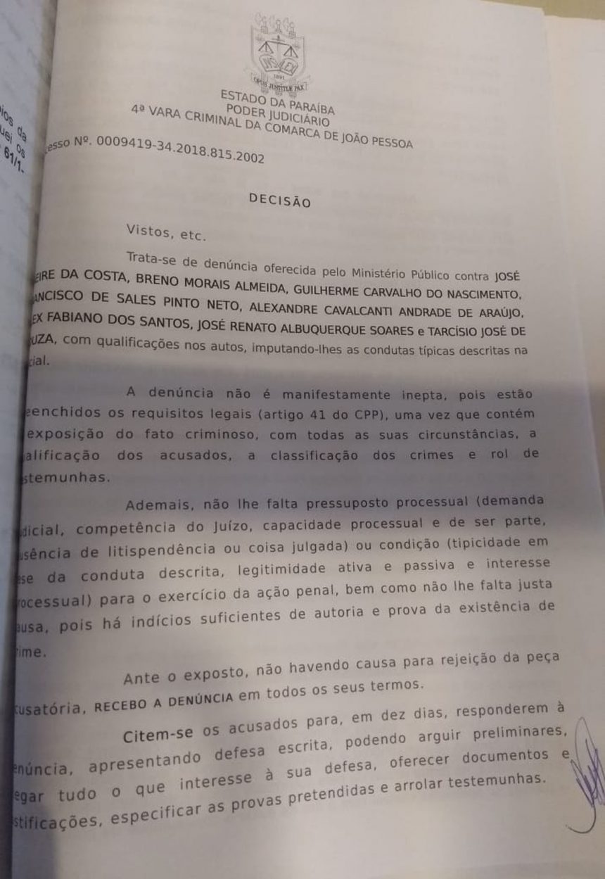 Tarcíso José, Breno Morais e José Renato, também acusados de fazerem parte da Organização Criminosa nesta ação, já cumprem essas mesmas medidas cautelares e já são réus de outra denúncia do MPPB sobre o caso. Todos os denunciados agora têm dez dias para para enviar suas defesas por escrito ao juízo.