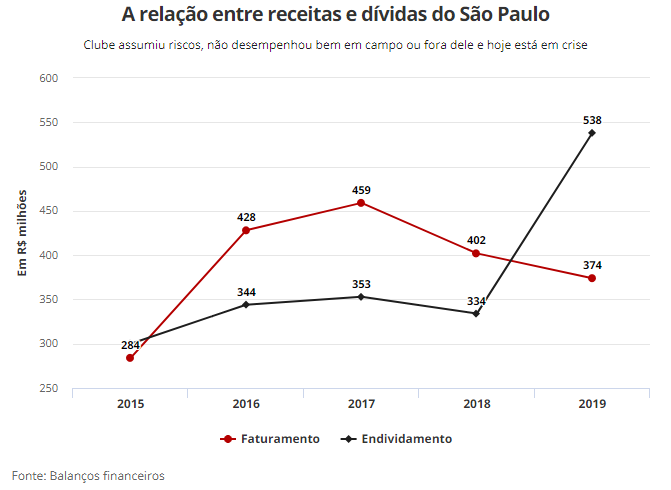 O São Paulo sempre pôde se orgulhar de ter estabilidade financeira. Nos anos 2000, a diferença entre faturamento (tudo o que arrecada) e endividamento (tudo o que deve) sempre esteve por volta de 0,5. Em outras palavras, as receitas sempre representaram o dobro das dívidas.