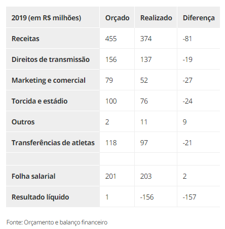 Antes de seguir adiante para outros indicadores financeiros, podemos comparar as projeções feitas pelo próprio São Paulo para a temporada passada, em seu orçamento, versus os valores realizados e publicados nas demonstrações financeiras. Sobrou frustração, faltou dinheiro.