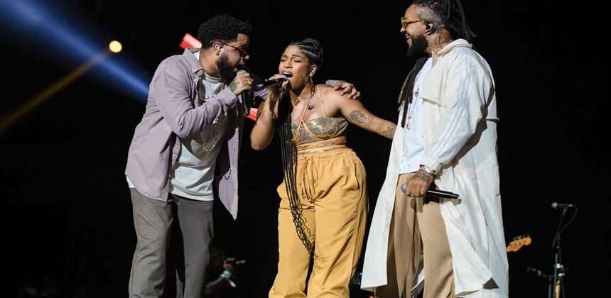 Emicida anuncia que a ocasião é especial para o rap. “A música cura, a música é nossa religião, Mano Brown, DJ KL Jay, Criolo tudo no mesmo palco. Hoje é um dia histórico”, comenta o rapper, que na sequência canta “Noiz”, de 2013.