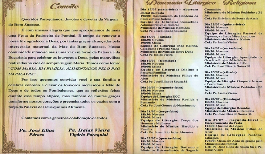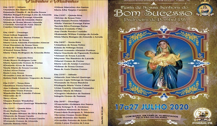Abordando o tema: “Com Maria, em família, alimentados pelo pão da palavra”, começa nessa sexta-feira (17) a festividade da padroeira do município de Pombal Nossa Senhora do Bom Sucesso. A abertura do evento será marcada pelo hasteamento da bandeira da festa e missa solene, às 19h, tendo como equipe litúrgica os Conselhos Administrativo e Pastoral.