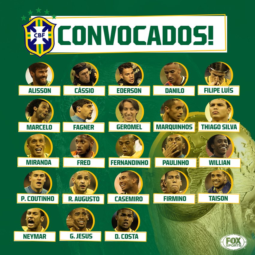 O técnico Tite divulgou na tarde desta segunda-feira (14 de maio) os 23 jogadores que representarão o Brasil na Copa do Mundo. Após a convocação, o treinador deu coletiva de imprensa e foi questionado sobre os 12 nomes da lista de suplentes, mas inicialmente não revelou nenhum nome enviado à Fifa.