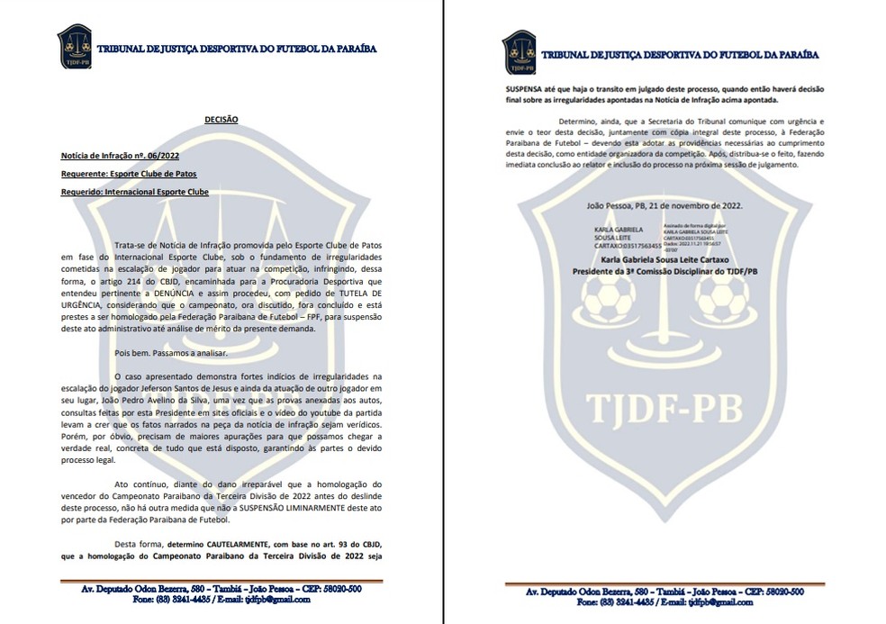 O documento assinado por Karla Leite, presidente da Comissão Disciplinar, determina que a FPF-PB só homologue o resultado da 3ª divisão após este julgamento, que pode punir o Internacional-PB segundo o que rege o artigo 214 do Código Brasileiro de Justiça Desportiva (CBJD). Após ser notificada de forma oficial, a entidade máxima do futebol paraibano acatou a decisão.