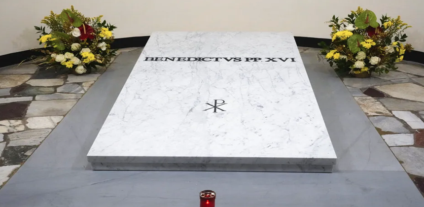 O nome de Bento XVI, o 265º pontífice da Igreja Católica, foi gravado em uma placa de mármore branco, que foi colocada sobre o túmulo.