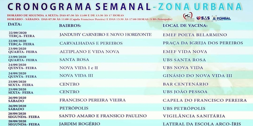 VEJA AS DATAS E OS LOCAIS DE VACINAÇÃO NA ZONA URBANA DE POMBAL